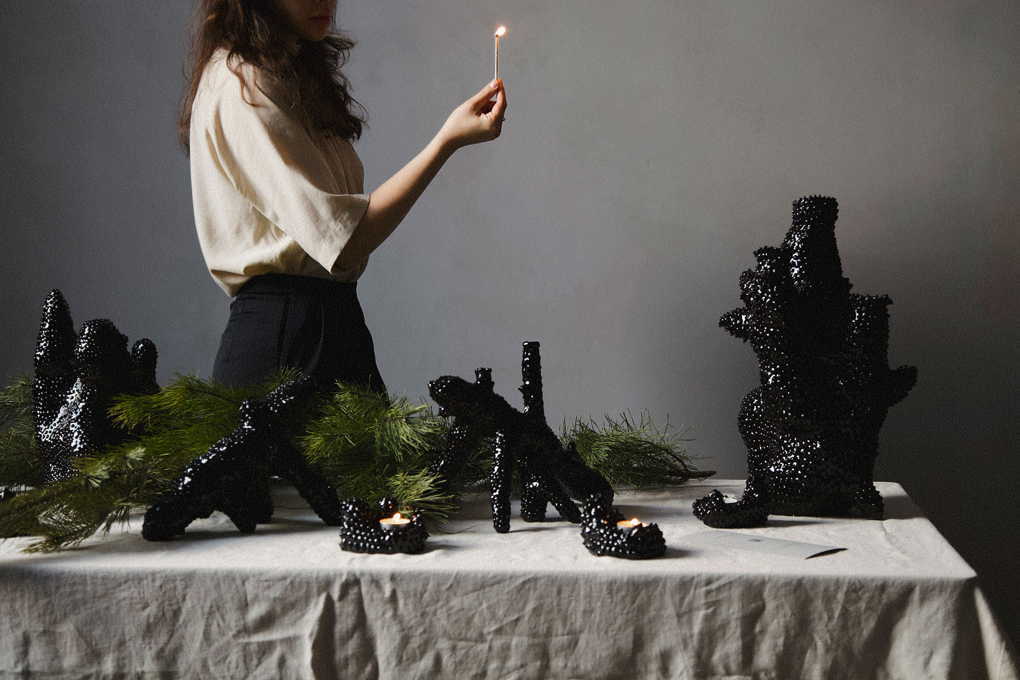 The candleholder series "Black Moss Comes Alive at Night" transports us into the magical world of a winter forest. Here, night reigns over day, and mossy roots and anthills come to life in the impenetrable darkness. It's that moment when it becomes hard to tell — is it just a play of shadows, or a mysterious creature hiding behind a tree?