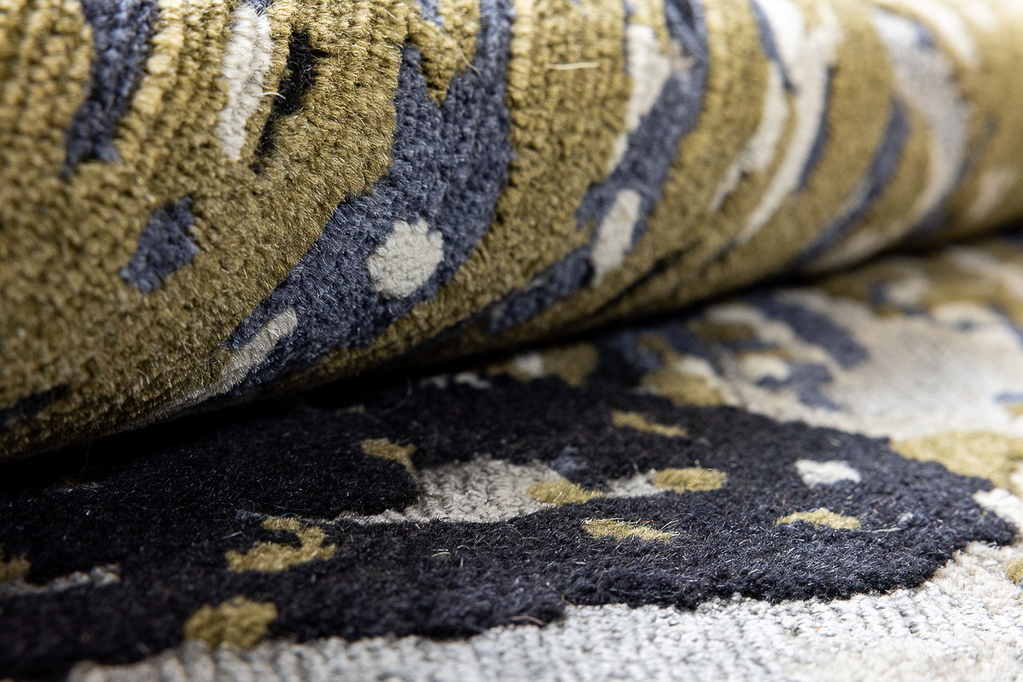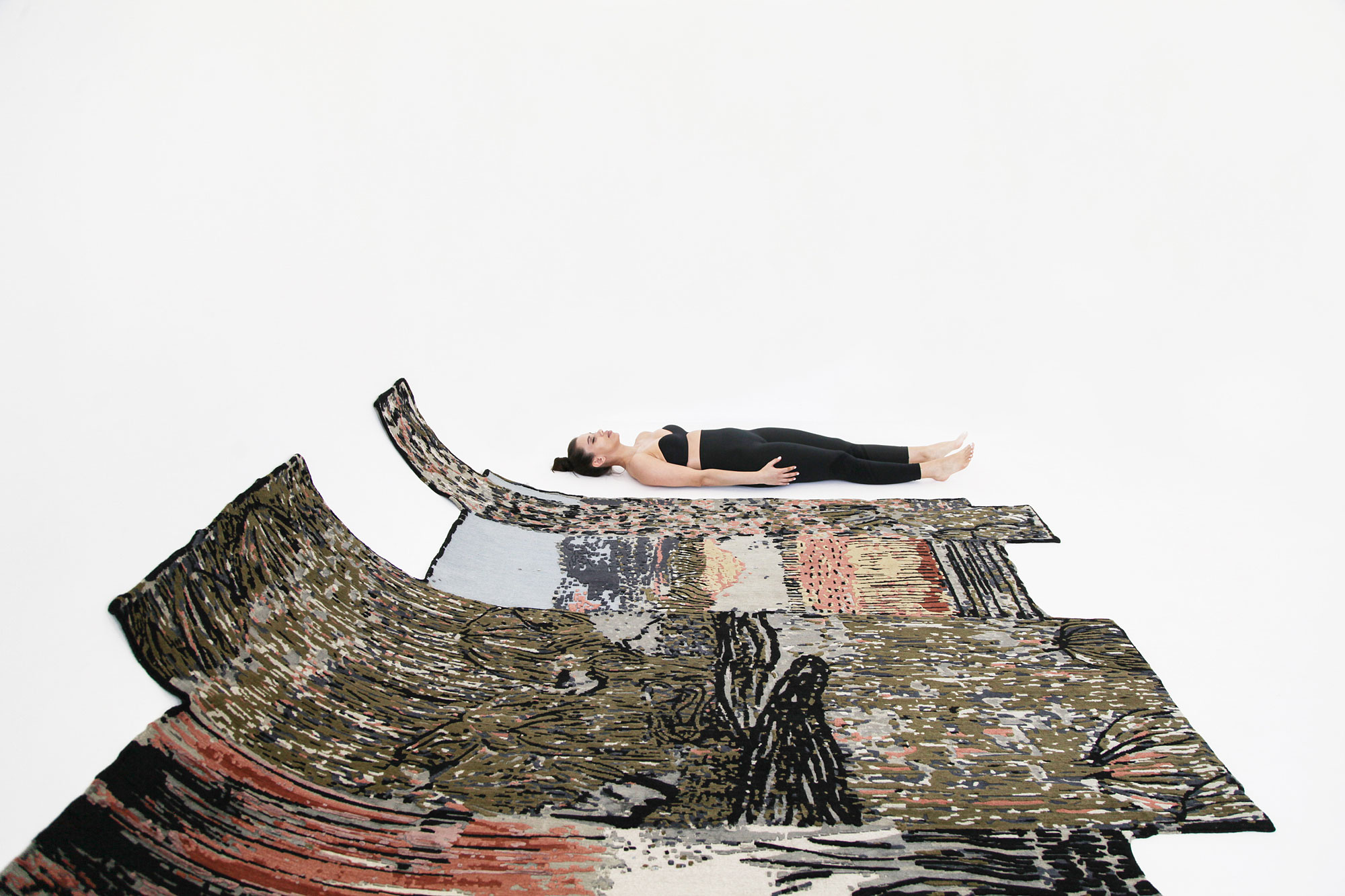 The designer immersed herself deeply in the rug-making process: carefully selecting colors, yarn composition, knotting and shearing techniques. Wool brings a sense of warmth to the piece, while various hand-knotted techniques create a rich texture. Eucalyptus adds a silky feel and a muted sheen—inviting the viewer to explore the rug from different angles and follow the transitions from dark to light. The varying pile heights set a rhythm and guide the gaze, making the rug especially tactile and full of life