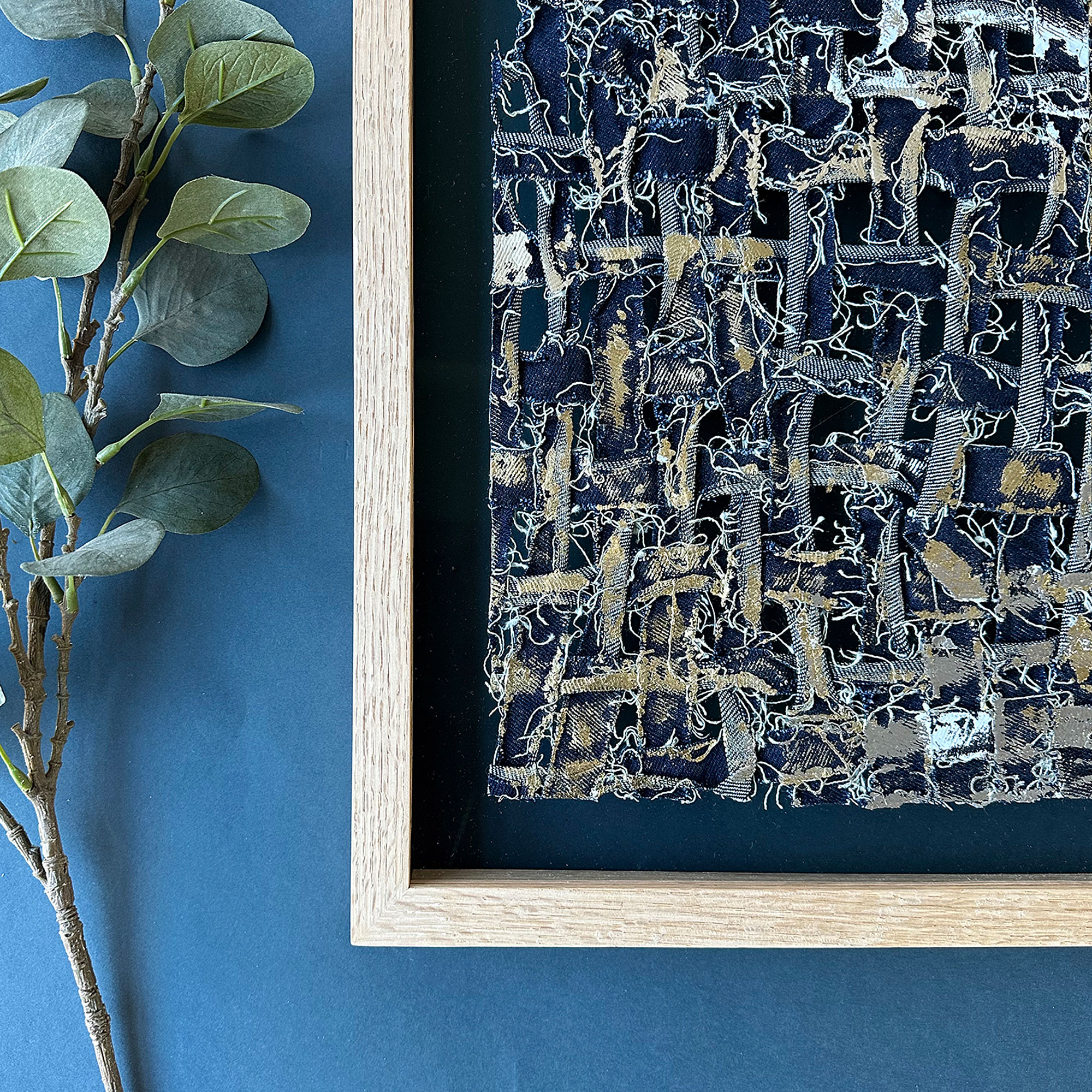 Momoka Gomi’s woven textiles are meditations on time, memory, and transformation. Grounded in a tactile, intuitive process, she reclaims denim — an everyday material worn by life — as a symbolic weft. Through repetitive hand-cutting and weaving, she constructs layered compositions that echo the erosion and preservation of memory. Her works often carry traces of distress and imperfection — frayed edges, faded blues, and soft textures — imbued with quiet resilience. Gold threads emerge as subtle markers of healing and continuity, inspired by the Japanese art of kintsugi. Balancing structure and emotion, her practice invites viewers into a personal yet universal reflection on the beauty of impermanence and the narratives held within fabric and form.