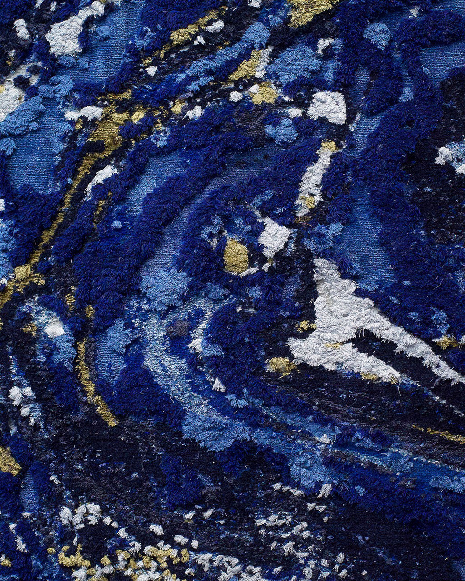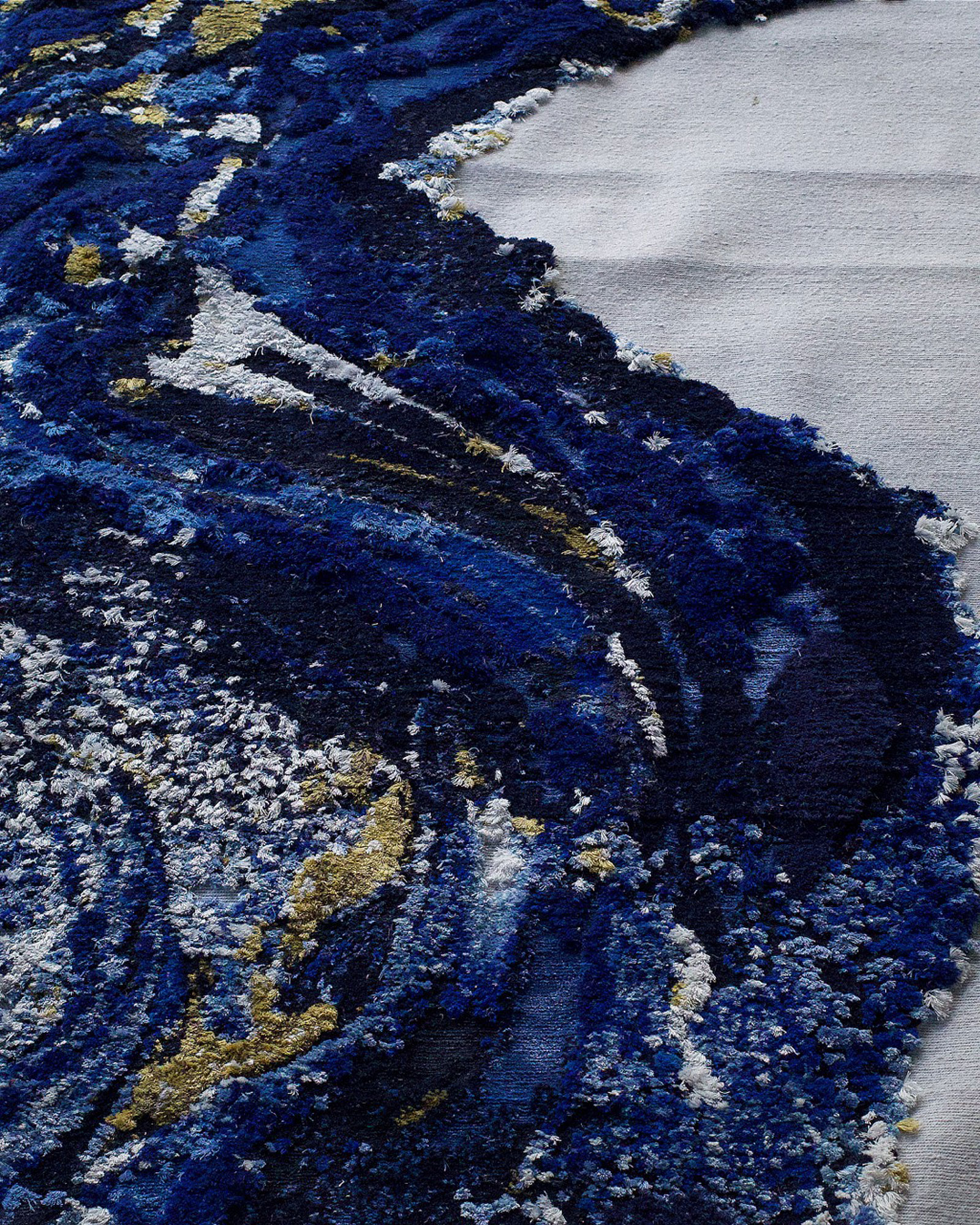 The color palette was carefully chosen—Bakst often combined ultramarine with intricate Eastern motifs in his sketches. The rug’s base is made of raw, unbleached wool with a lively, textured weave. The accent section features hand-dyed silk threads of varying heights, interwoven with gold fibers—creating movement not only through color gradients but also through texture and flexibility.
